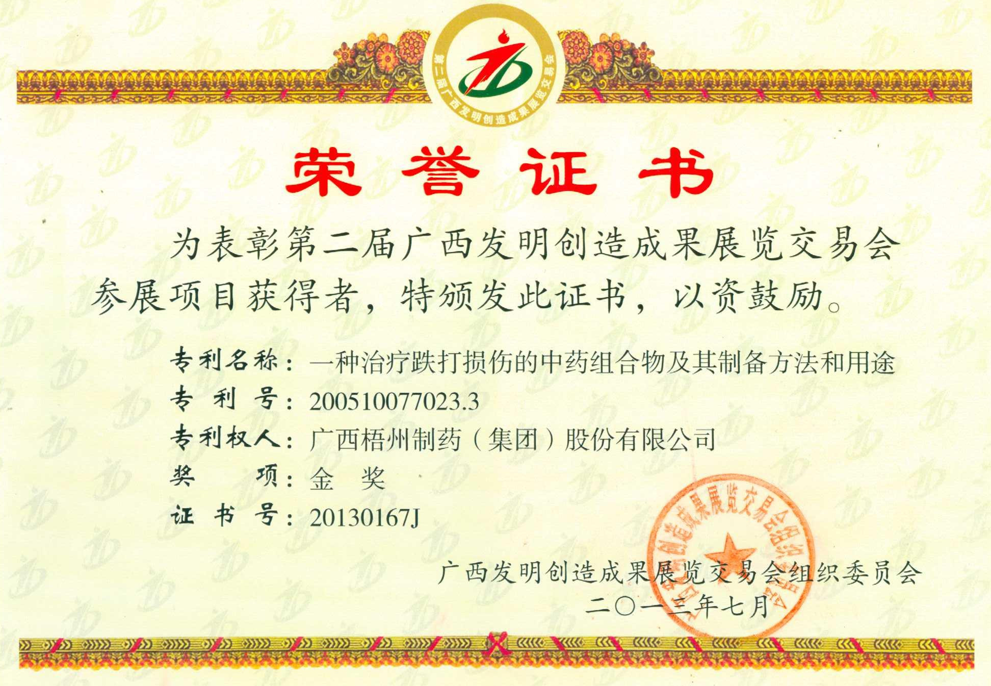 《一种治疗跌打损伤的中药组合物及其制备方法和用途》专利荣获广西发明创造成果展览交易会参展项目金奖