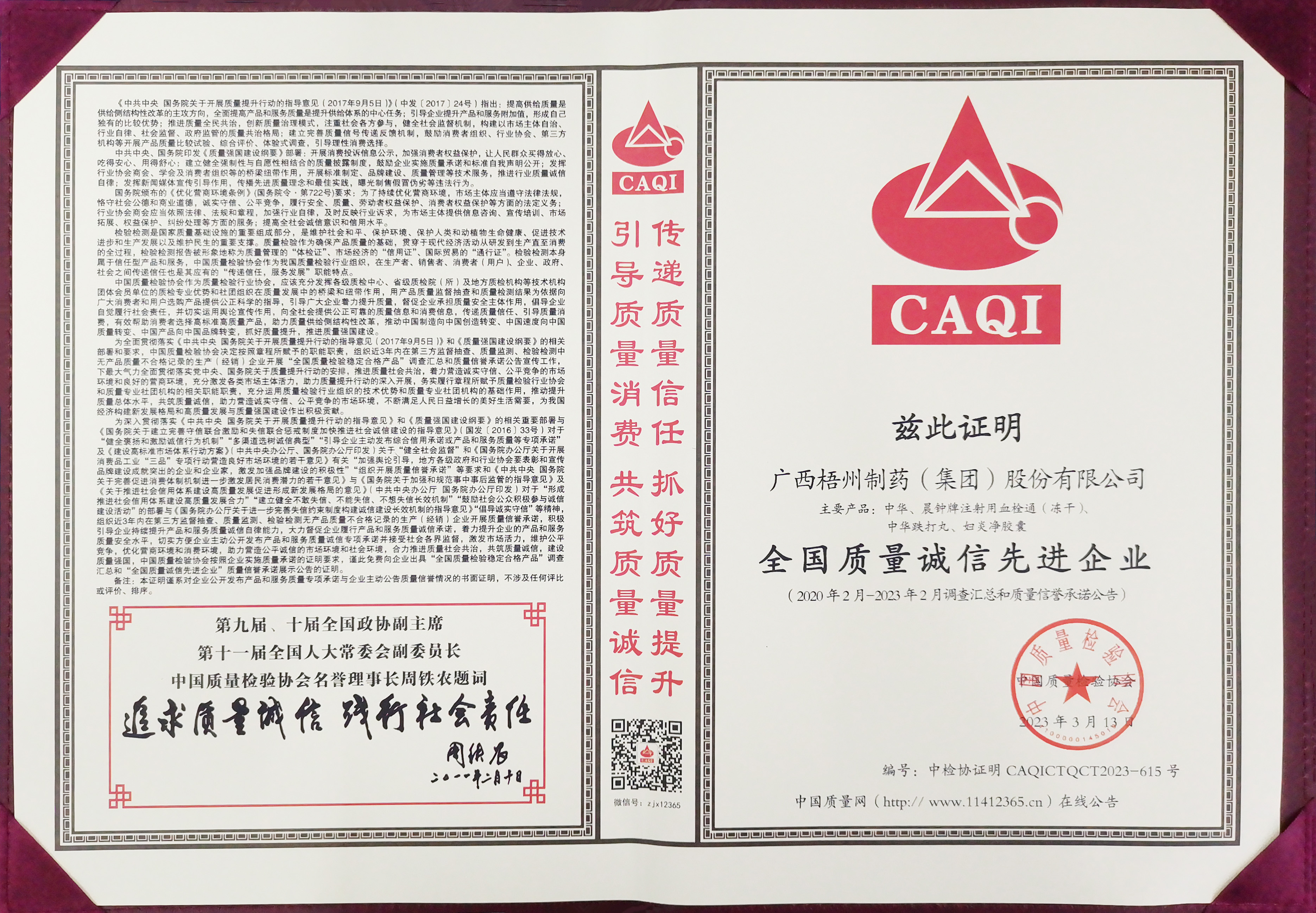 广西梧州制药(集团)股份有限公司荣获2023年全国质量诚信先进企业
