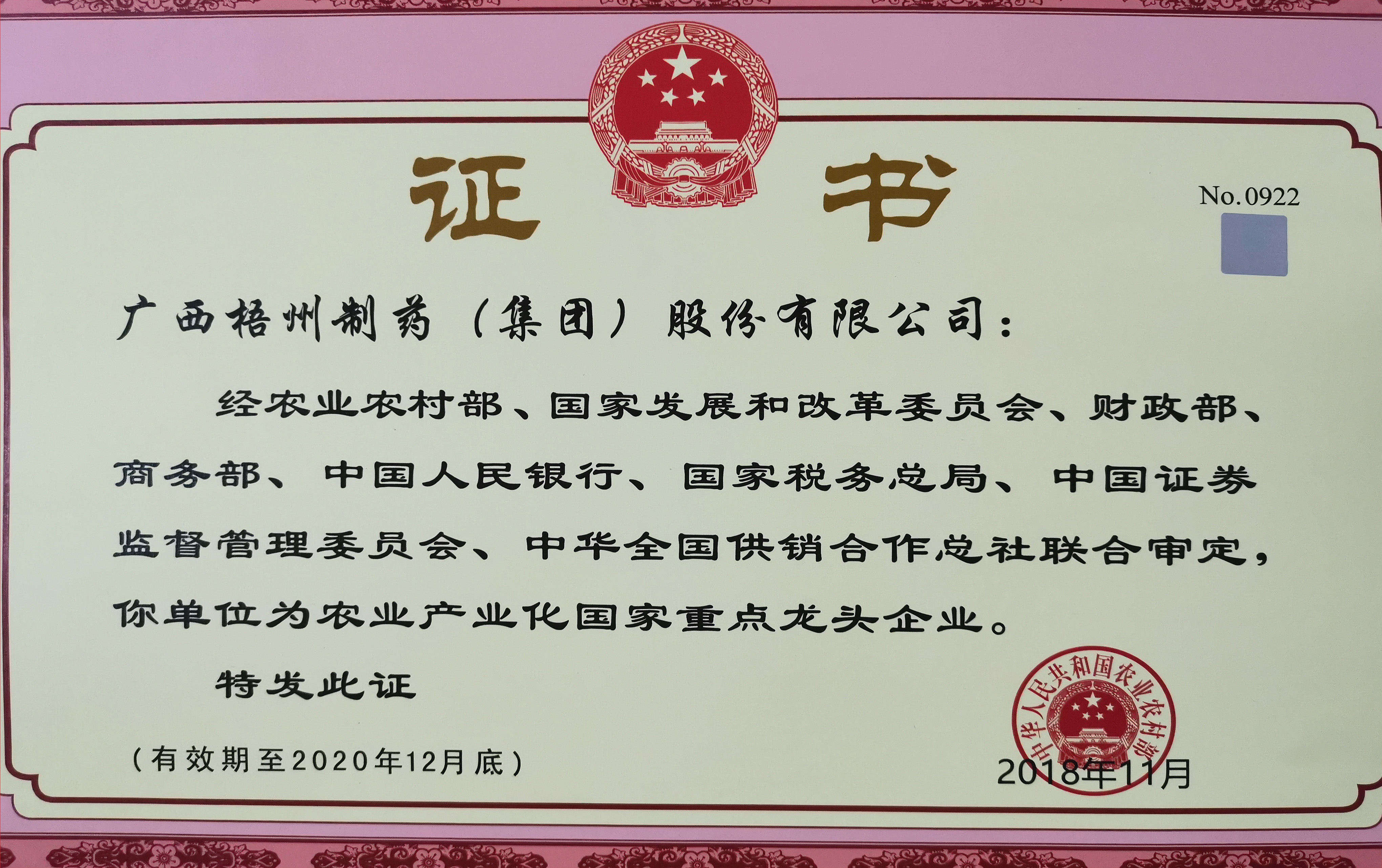 经农业农村部、国家发展和改革委员会、财政部、商务部、中国人民银行、国家税务总局、中国证卷监督管理委员会、中华全国供销合作总社联合审定,评为农业产业化国家重点龙头企业。
