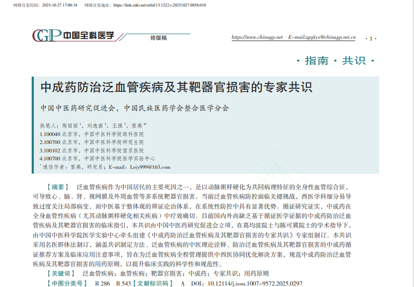 此次发布的专家共识,由葛均波院士、陈可冀院士担任学术指导,汇聚了43位来自全国19个省、自治区、直辖市,专业领域覆盖心血管、脑血管、肾脏、眼、外周血管及内分泌等泛血管疾病核心方向的权威专家。